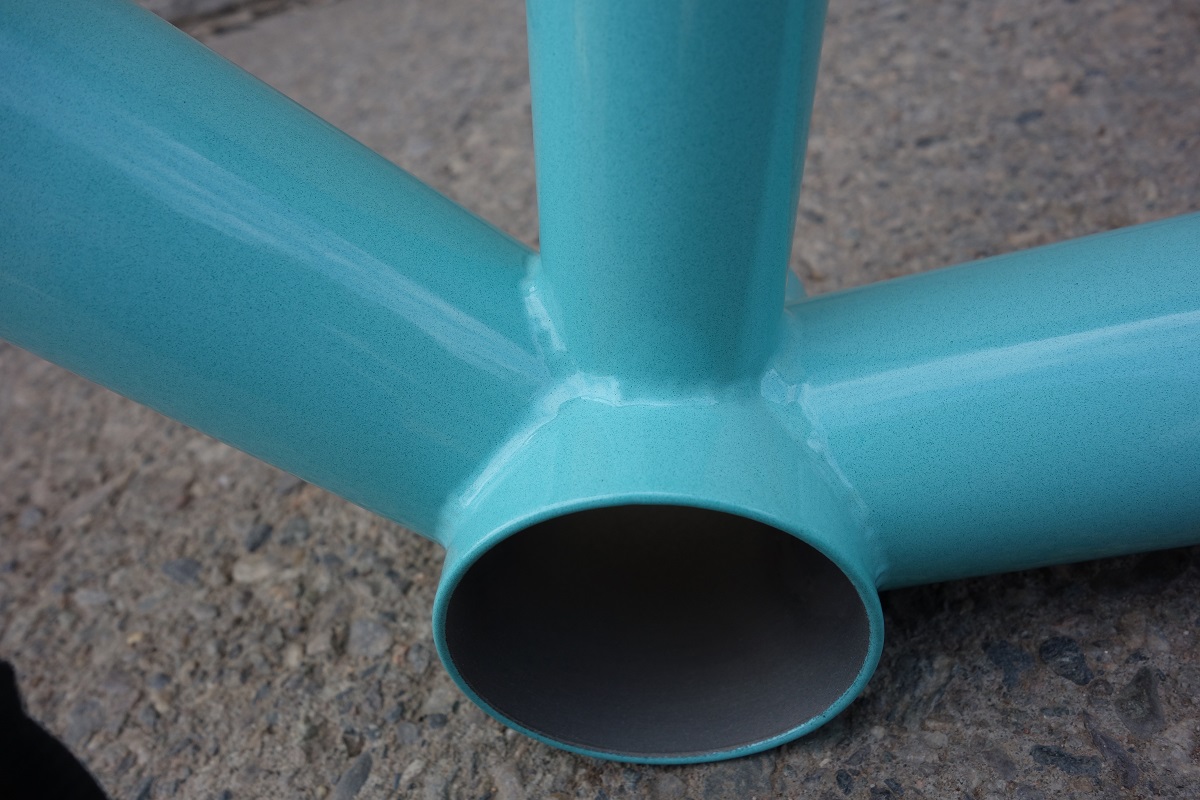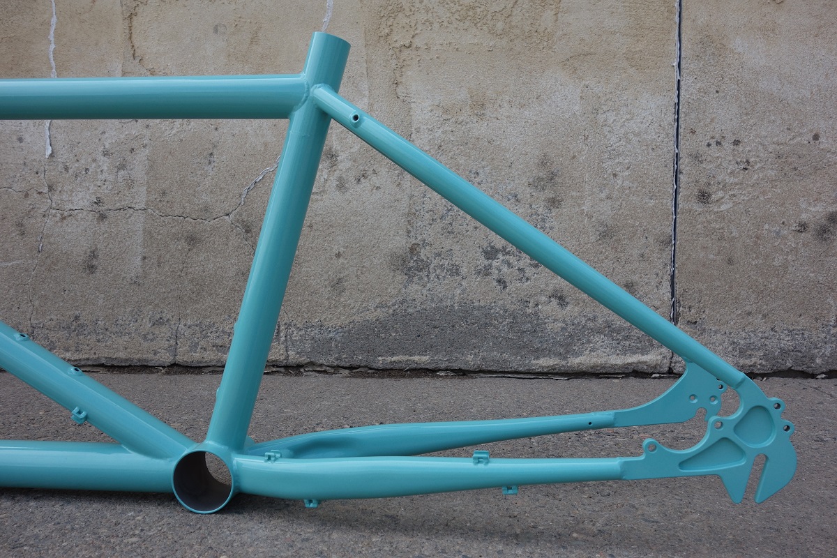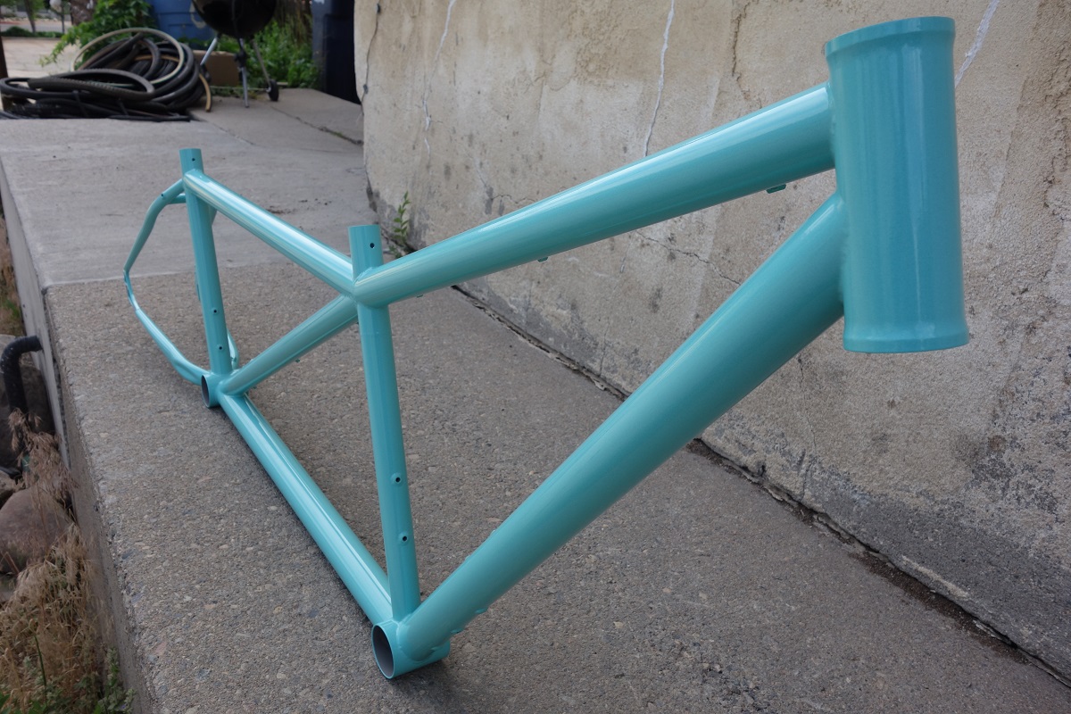 This was the first frame I’ve had done by the local powdercoaters (there’s only one), and I have to say, I think they did an amazing job. There were a couple small things the powdercoater and I talked about that we can change or improve for next time, but I honestly couldn’t be happier with the result. We’re just about in love with the color. Painted frame weight came out to 10lb 6oz.