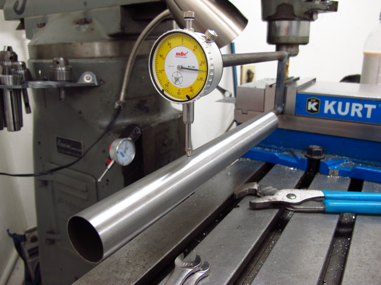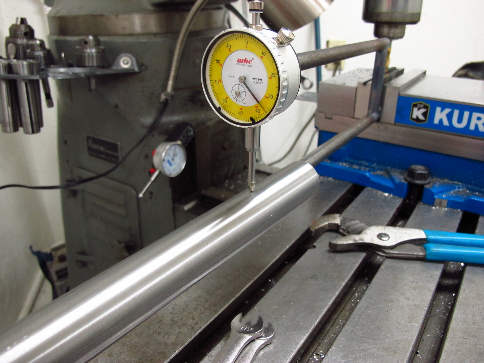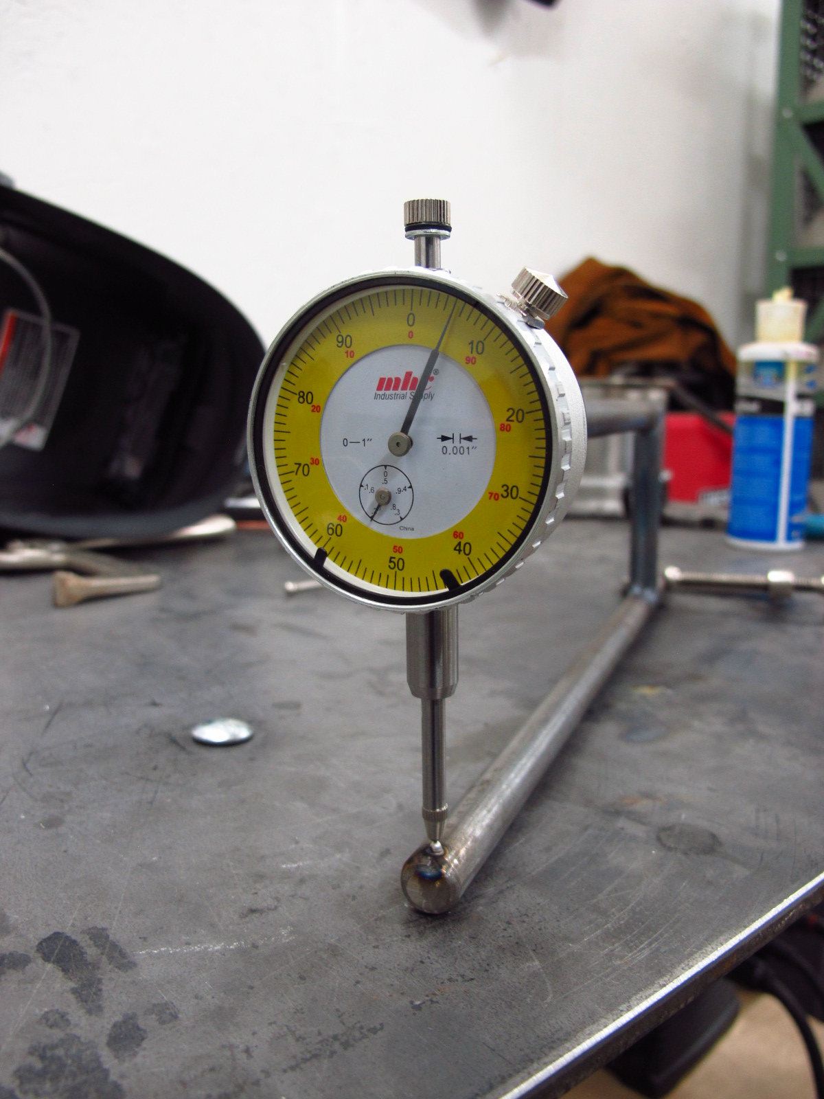 Even though I’m pretty good about keeping track of numbers like where the manufacturer says their tubing butts should be, it’s nice to just know for sure. I think it’s faster to just measure the wall of the tube and mark it right there. This idea is nothing new, I saw something just like this somewhere on the web. I just decided to make mine out of a cheapo chinese dial indicator and some 1/2″ steel rod.