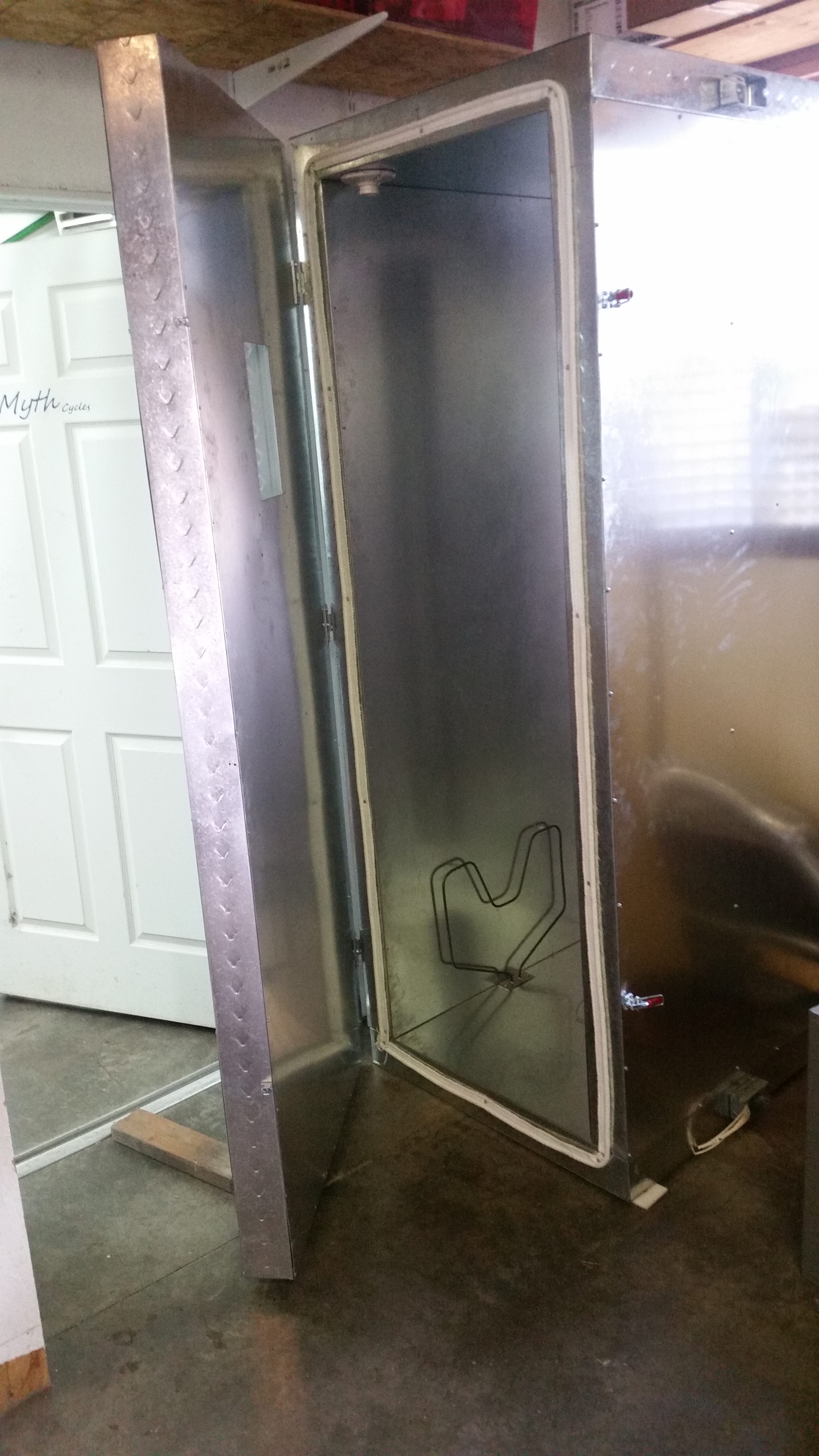 The oven is built from galvanized sheet metal and metal studs. Insulated with yellow fiberglass insulation, and it has two 2.5 kilowatt oven elements for a total of 5 kilowatts. I used a PID temperature controller with a K thermocouple from Auber instruments. The inside dimensions are about 28 x 32 x 82 inches, and it’ll fit 2 bike frames or one tandem. It warms up from cold in about 20 minutes, and in about another 20 minutes the oven walls are fully warmed up. If I open the door to stick a bike frame in, it takes about 5 minutes to warm back up to 400 F. I’ve calculated the energy it uses, and it’s astonishingly small. Once it’s up to temp, the elements run at about 50% power to keep the whole thing at 400F. So if I’m just powdercoating one or two bike frames it’s on for about 2 hours, which uses around 6.25 Kilowatt hours, or $0.75.