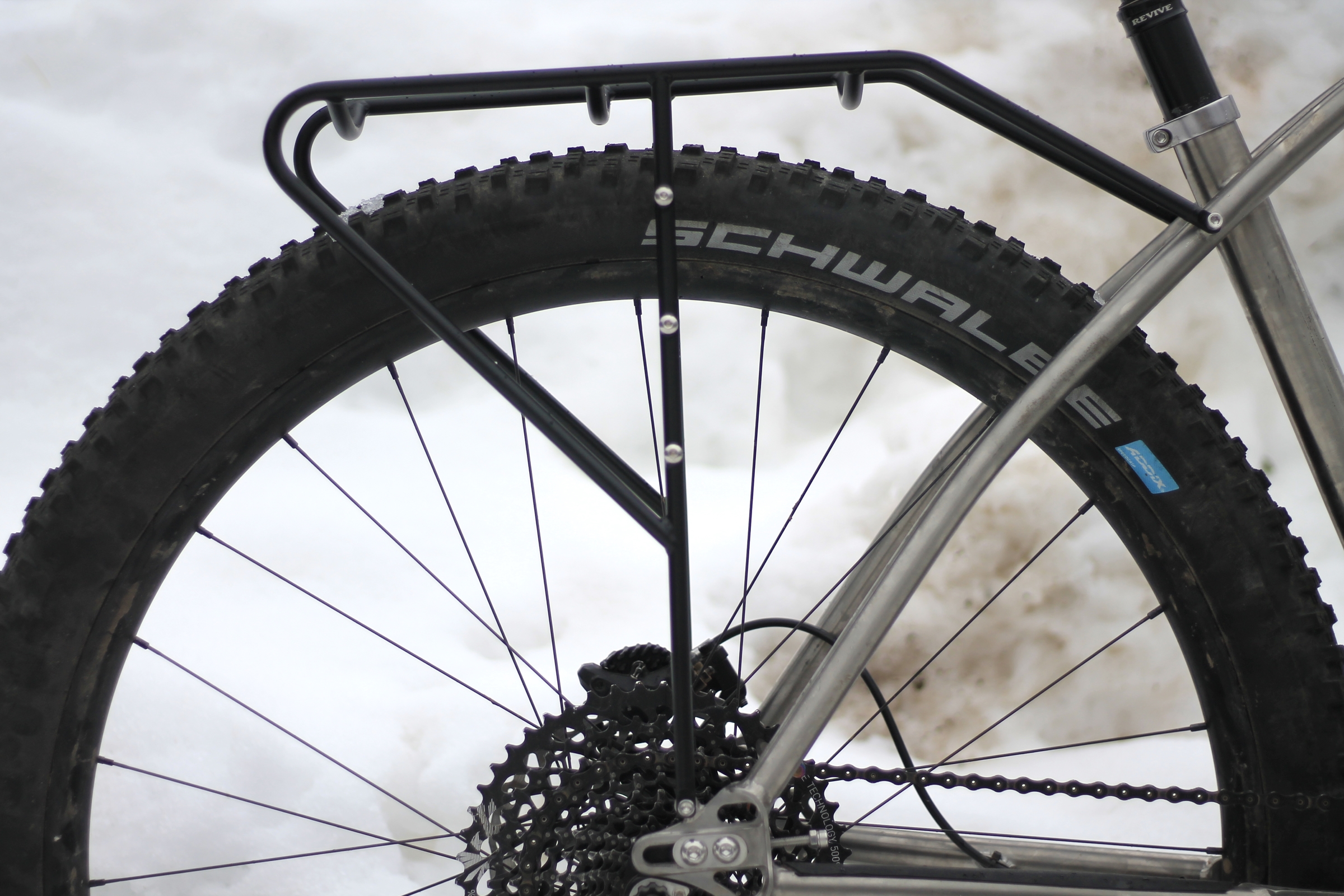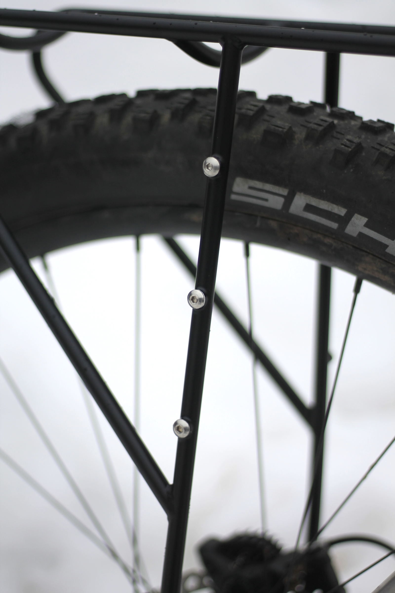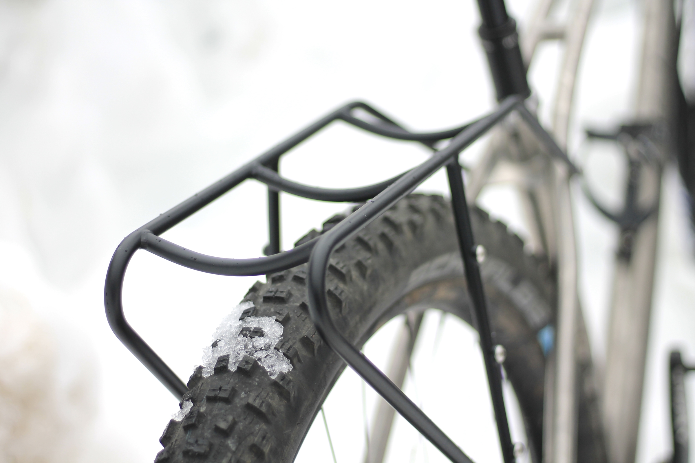 This client wanted a rack that was for bikepacking, with some specific design criteria. He wanted the crosspieces of the top platform to be curved down so that a stuff sack would sit in the top and move around less. He also wanted it to fit his bike specifically, and also to have triple bottle boss mounts on the vertical members. I took all his design considerations and this is what I made.