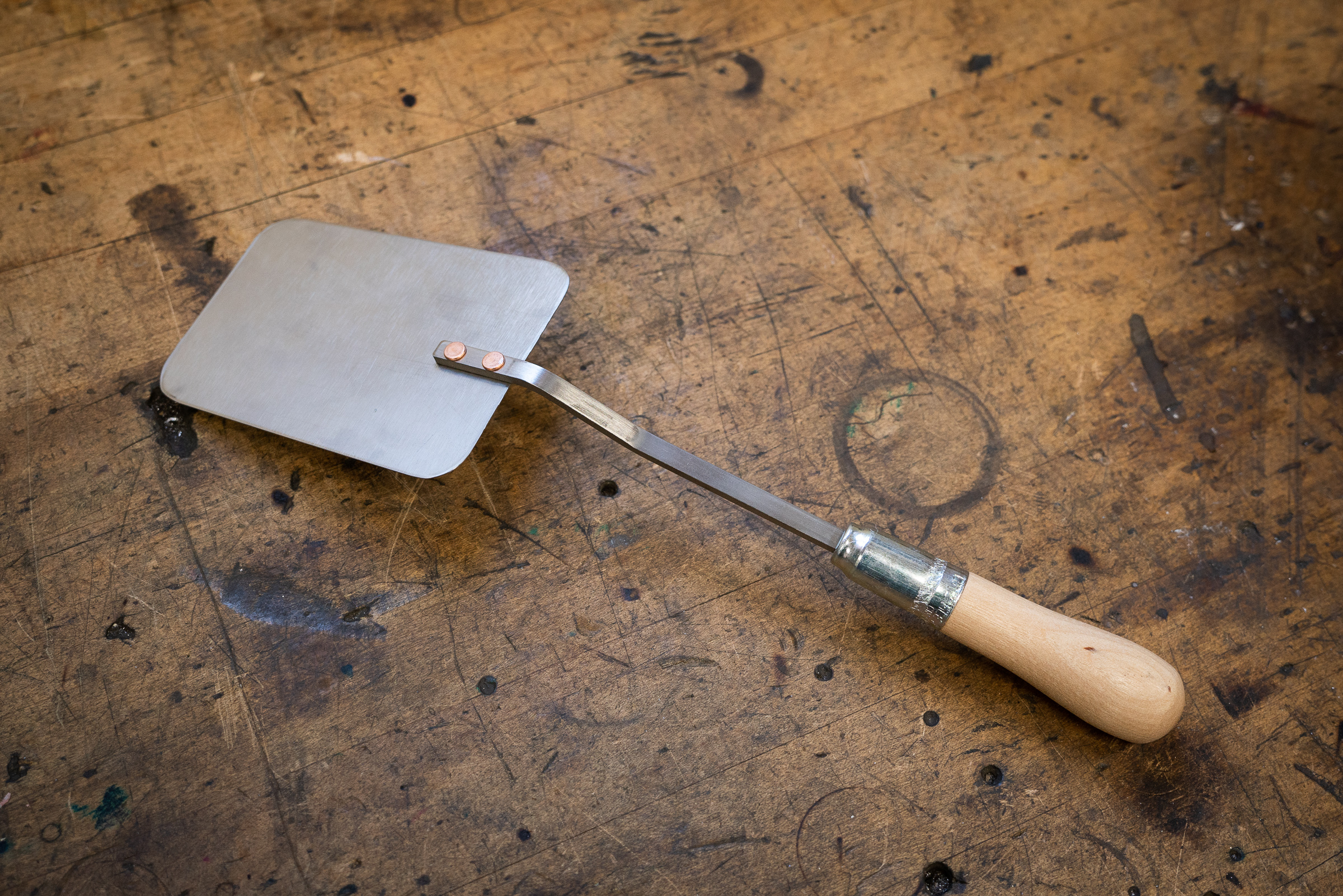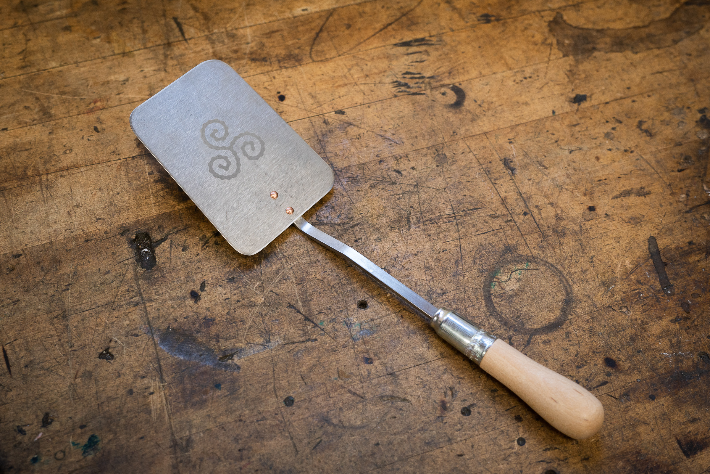 Weighing in at 65g it definitely might be the lightest spatula out there. The stem and blade are 6/4 titanium for a springy, yet compliant feel. The rivets holding the blade on are hammered copper. The handle is a Lutz Tool Co. file handle made in the USA. Each spatula has the Myth logo tactfully etched on the blade.